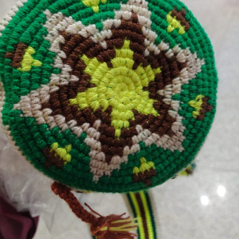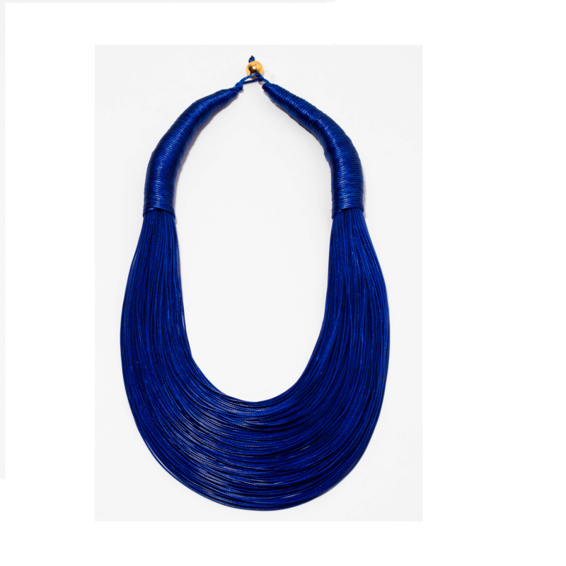 Collar elaborado en hilos en seda acrílica alta mente resistente a la humedad y al tiempo; termina en un balín de acero bañado en oro golfí que es el broche para el cierre, tiene un efecto cascada, para darle estilo al colocarlo Medidas: 28 cm, puesto 13 cm