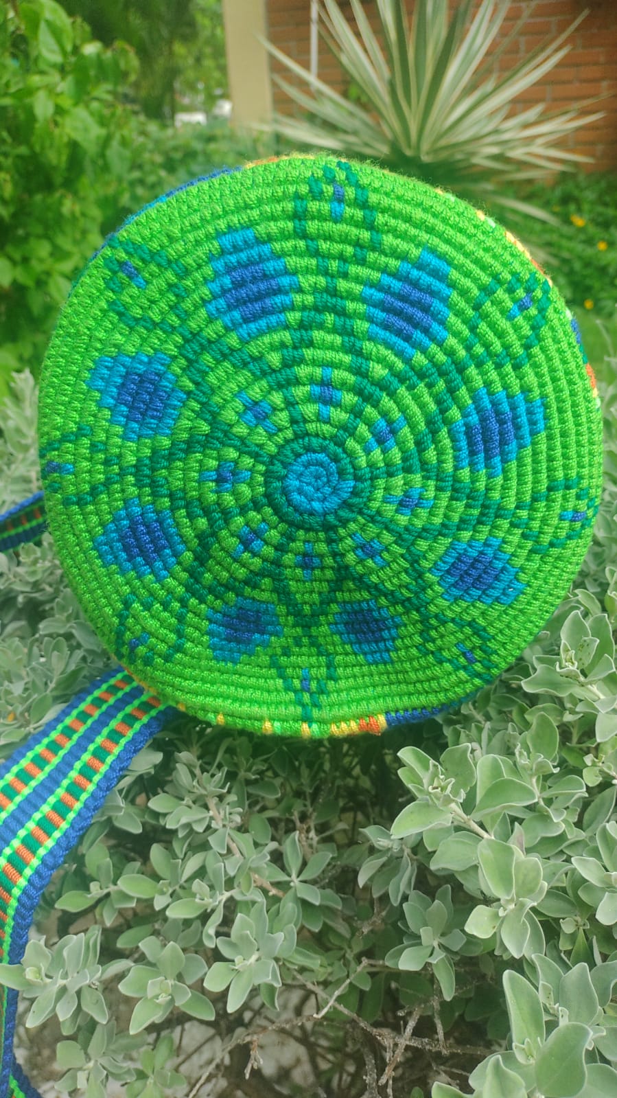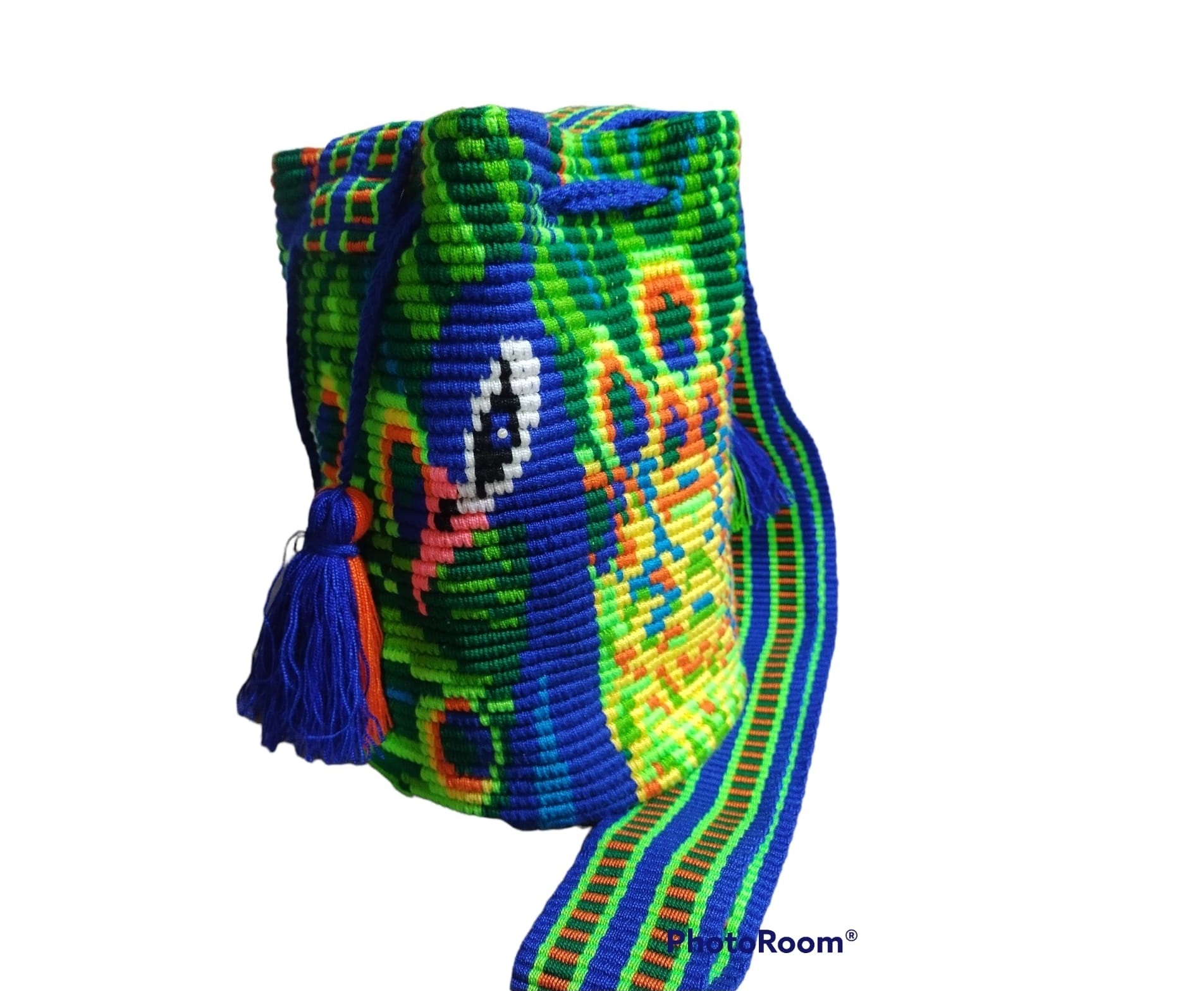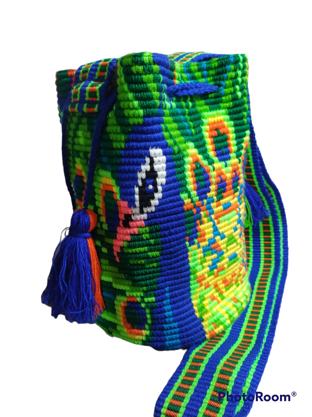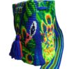 Mochila tejida en hilo líder, técnica crochet a dos hebras, asa en telar tipo San Jacinto, por artesanos de Chorrera en departamento del Atlántico (Colombia).